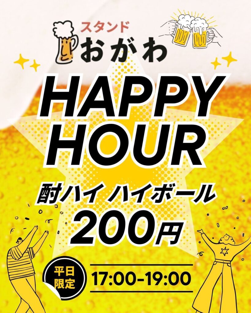 【スタンドおがわ】2月よりハッピーアワーがスタート!By corporation-ok / 2026年2月3日 2月よりスタンドおがわにて、平日限定のハッピーアワーが始まります! 人気のハイボールに加えて、各種酎ハイを全て200円でご提供いたします。 (※ハッピーアワーは17時から19時までになります。) 平日、お仕事で疲れた体に、ハッピーな1杯いかがですか スタンドおがわ【住所】大阪市中央区千日前2-8-10【電話番号】06-6630-6000ご予約等、ぐるなびもしくはお電話でも受付可能です。